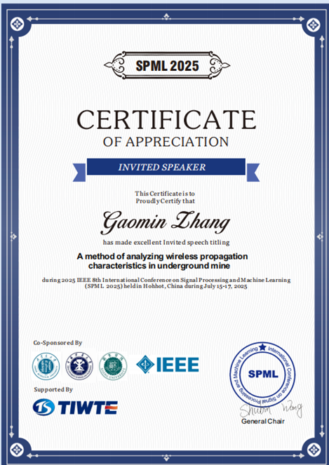 公司教师张高敏博士受大会组委会特邀,在“智能感知与通信技术”分论坛作题为《A method of analyzing wireless propagation characteristics in underground mine》的学术报告。该研究针对煤矿井下复杂电磁环境,分享了一种适用于煤矿井下的电磁波传播特性分析方法,为矿山智能化建设提供了技术支撑,受到与会专家的高度关注。