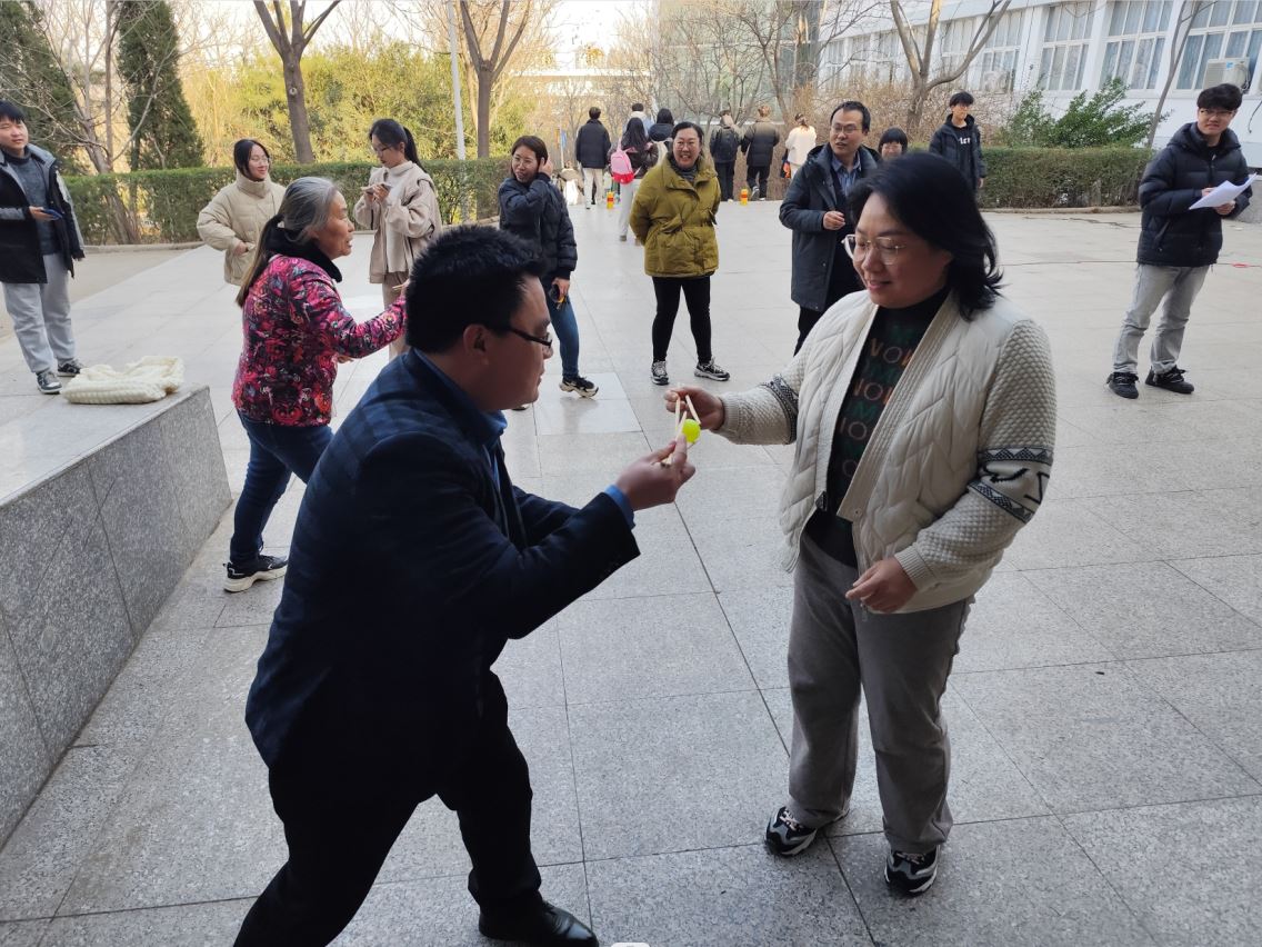 趣味运动会期间,教职工以教研室为单位组队参加,学工团队以年级为单位组队参加。趣味运动会活动包括投壶、踢毽子、珠行万里、筷子夹乒乓球、跳大神等项目。筷子夹乒乓球活动中,参与者5人一组,队员站成一排,手拿一双筷子,将乒乓球从一端接力夹到另一端,在规定时间内夹球数最多队获胜。