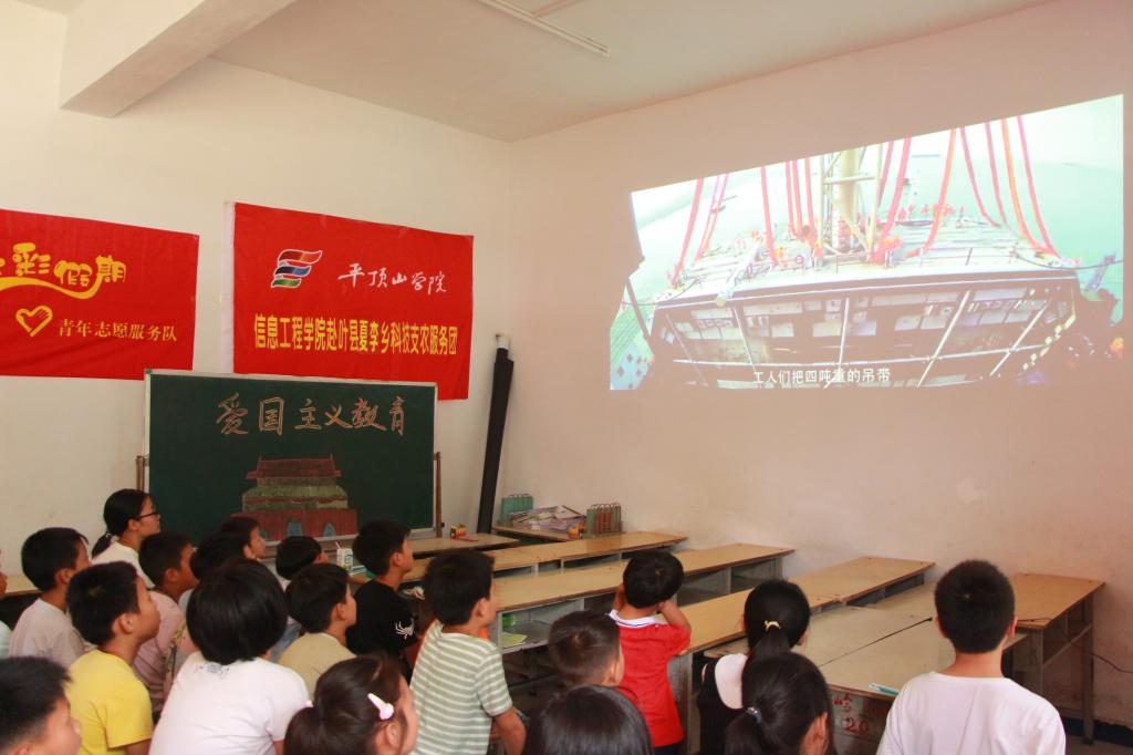 活动伊始,小朋友与志愿者们在教室准备爱国教育课程,许岭村驻村第一团支部书记李永恒也前来观看。志愿者引导孩子们全体起立,演唱国歌,伴随着孩子们的歌声,活动正式开始。支教组的志愿者为孩子们播放爱国主义宣传片——《祖国妈妈我爱你》。影片结束,志愿者们对孩子们进行提问:“习近平爷爷对小员工有什么寄托?”孩子们踊跃发言,现场氛围热烈,赵嘉亮小朋友说:“习爷爷希望我们好好学习、天天向上、认真上课”,简单的话语,传递出孩子们浓浓的真情。紧接着,志愿者提到:“五星红旗上的大星代表什么?‘四颗小星绕着大星’又有什么含义?”;张文树小朋友认真的说道:“大星就是中国共产党,小星是亿万人民,小星绕大星就是五十六个民族相互团结、围绕着中国共产党”,张文树小朋友的回答赢得的在座志愿者和小朋友们的掌声。随后,志愿者们为小孩子们播放《厉害了,我的国》这一爱国主义短片,并拿出书李书记代表共青团中央倡导的关爱留守儿童活动“七彩假期”志愿服务项目中的拼图,希望通过拼图活动,让孩子们更加了解中国的领土分布,认识到中国领土不可分割。志愿者们让孩子们发挥想象力,画出他们心中关于爱国的东西,表达自己对祖国的热爱。其中张文树小朋友画的天安门图画最认真,淡黄色彩笔摹画出的天安门轮廓、三朵淡蓝色的云彩、鲜红色的红旗、金黄色彩色勾勒的五颗星星以及褐色的英雄人民纪念碑,这样一幅宏大而鲜明的图画、这样一幅孩子心中铭记的天安门,正是孩子对祖国的无限热爱。除此之外,对于今天听课认真的陈新亮、王依霖、许笑含等十位小朋友,志愿者们将其选为今日之星、进行鼓励表扬。
