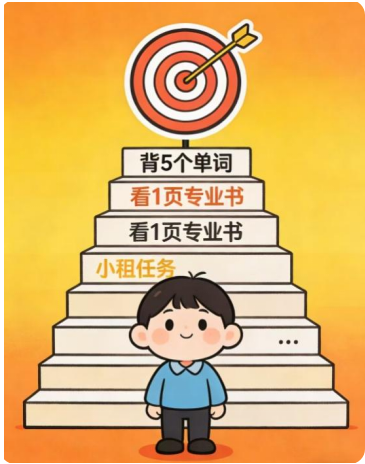 面对目标感到焦虑?试试小步行动法:把大目标拆解成10分钟就能完成的小任务,比如“背5个单词""看1页专业书”。先做最容易的那一步,行动起来后,焦虑会随着进度慢慢消散~别想太多,先迈出小小的一步吧!