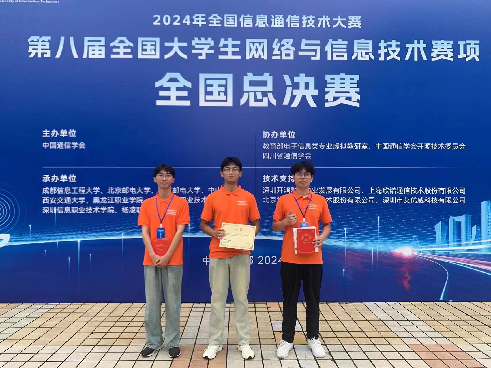 7月21日,公司员工在宁超魁老师带队指导下,在成都信息工程大学举办的2024年全国信息通信技术大赛(第八届全国老员工网络与信息技术赛项全国总决赛)上再创佳绩。其中2021级通信专业孟硕同学荣获“光宽带网络工程实践赛道”二等奖,2022级通信专业王昱强和2021级通信专业郭文祥分别荣获“5G网络工程实践赛道”三等奖。