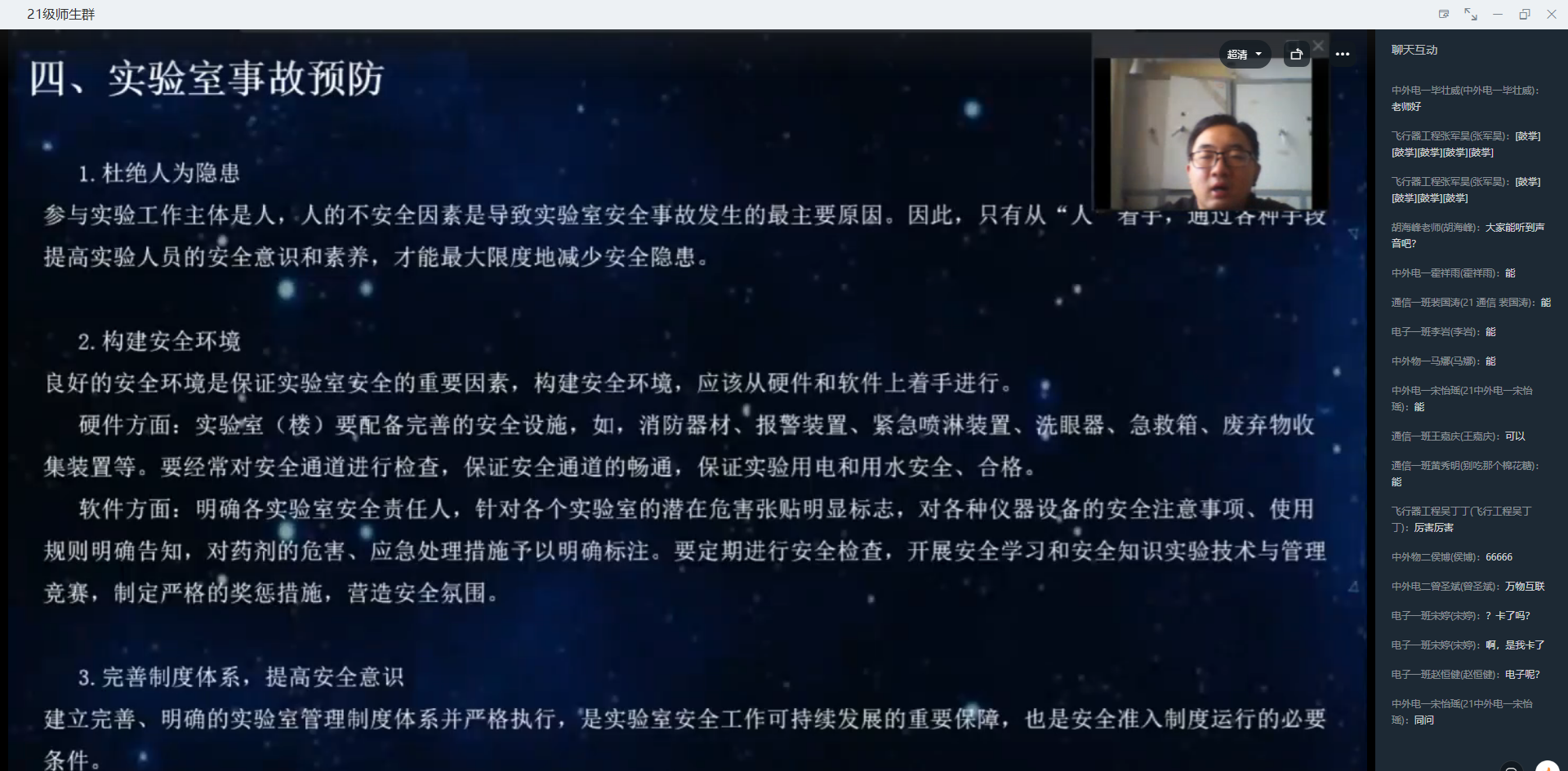 为加强实验室安全管理,提高师生实验室安全意识和技能,预防和减少实验室安全事故的发生,2021年09月29日上午8:00-10:00,通过腾讯会议的方式,伟德国际bevictor1949对院系新进教师及2021级新生进行了实验室安全教育相关知识的培训。