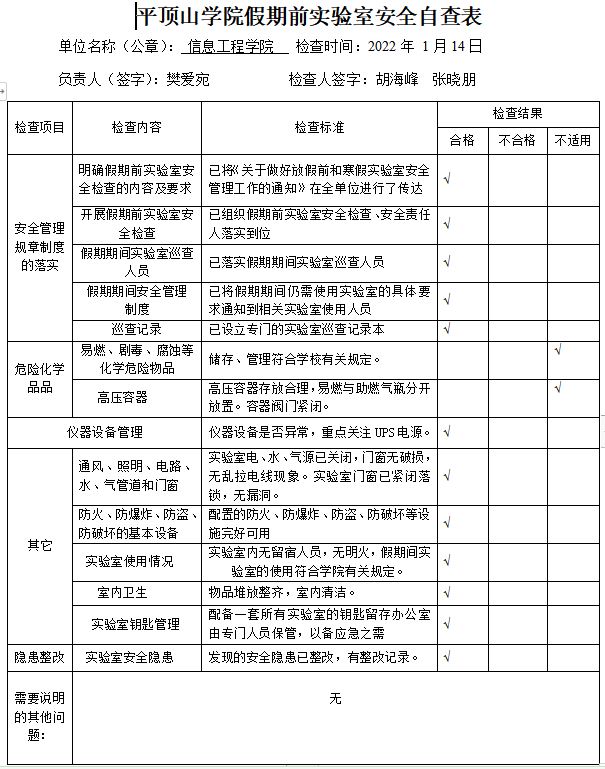 通过认真组织一次全面的实验室安全检查,特别做好了实验室的危险化学品、仪器设备、UPS电源、压力容器、电气设备、水电气暖等设施方面的安全检查。对发现的问题和隐患进行闭环管理和限时整改,做到了“不放过任何一个漏洞,不丢掉任何一个盲点,不留下任何一个隐患”,坚决防范和遏制实验室重特大事故的发生。